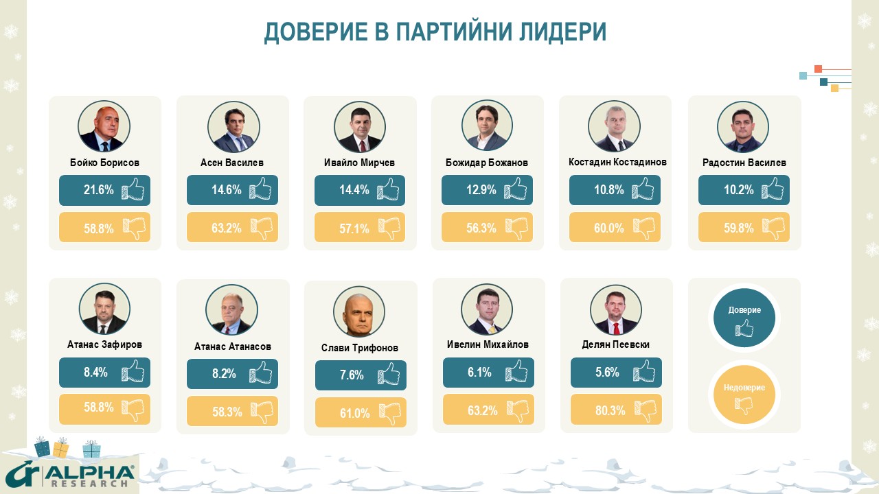 - След като уловиха обществените настроения и подкрепиха масовите протести, ПП-ДБ влизат в положителна траектория. Вотът за тях нараства с почти 4 пункта и през декември стига до 17.8% от решилите да гласуват. Лидерите на коалицията не извличат лични дивиденти, но запазват добри позиции. Асен Василев получава 14.6% доверие срещу 63.2% недоверие, Ивайло Мирчев – 14.4% доверие срещу 57.1% недоверие, Божидар Божанов – 12.9% доверие срещу 56.3% недоверие. По-ниско остава одобрението за Атанас Атанасов – 8.2% срещу 58.3% неодобрение.