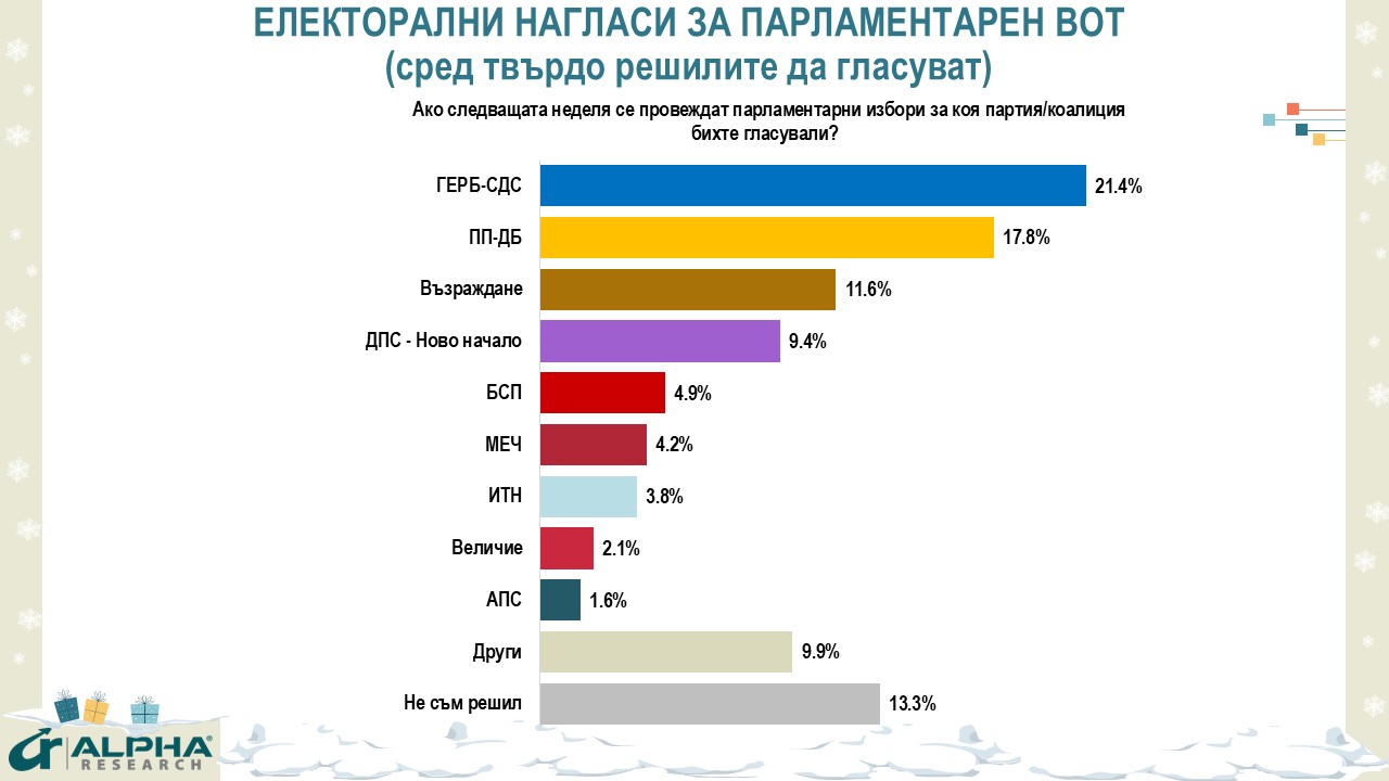 Настоящото изследване е проведено в периода 5 – 12 декември 2025г. и е част от регулярния мониторинг на Алфа Рисърч. Публикува се на сайта на агенцията и се реализира със собствени средства. Проучването е проведено сред 1000 пълнолетни граждани от цялата страна. Използвана е стратифицирана двустепенна извадка с квота по основните социално-демографски признаци. Информацията е събрана чрез пряко стандартизирано интервю с таблети по домовете на анкетираните лица.