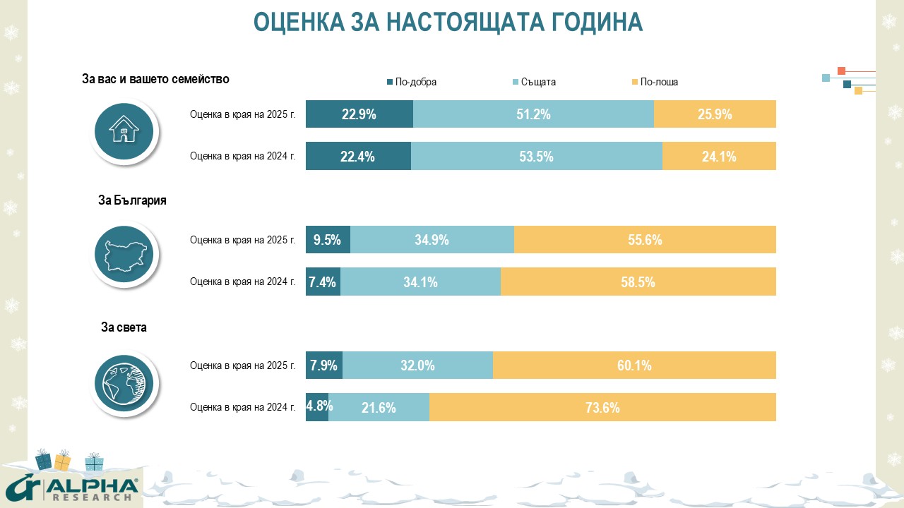 На този фон се запазва тенденцията българите да оценяват отминаващата година като по-успешна за тях и семействата им, отколкото за страната и света.