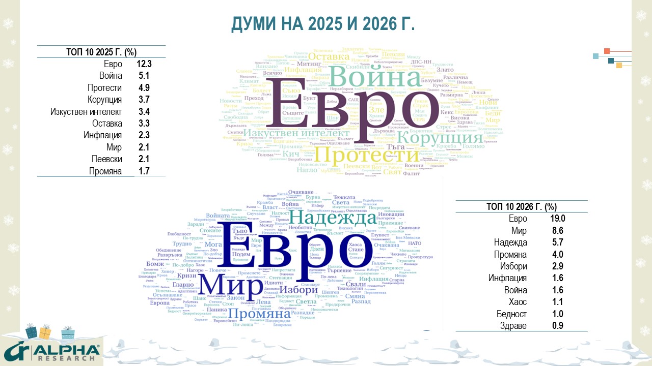 - „Евро“ е думата, която характеризира в най-голяма степен отминаващата година и същевременно символизира 2026-та, тъй като процесът започна през настоящата, а ще приключи с въвеждането на новата валута през следващата. Това касае пряко ежедневието на всеки българин и безспорно ще е водещото събитие в историческите справки за нашето съвремие.