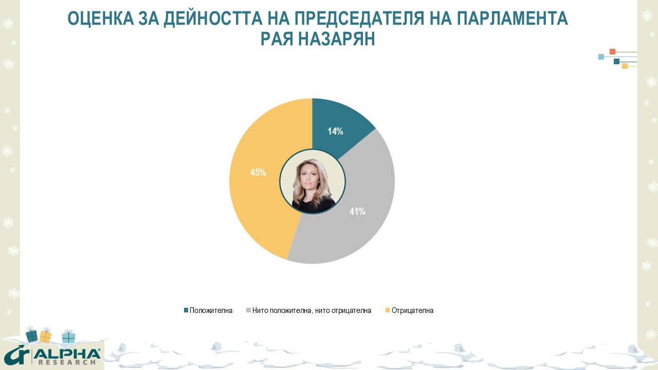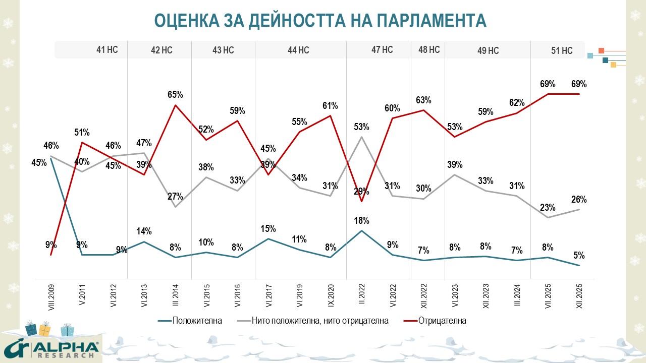 Далеч по-силна е обществената неудовлетвореност от дейността на 51-то НС, превърнало се в терен на нестихваща политическа конфронтация и нелицеприятни сцени. В края на годината парламентът получава одобрение от едва 5%, неодобрение от 69% и 26% неутрално отношение, като дори привържениците на представените в него партии са силно критични. Председателят на НС Рая Назарян се ползва с доверие от 14% (предимно симпатизанти на ГЕРБ), недоверие от 45% и 41% неутрални оценки.