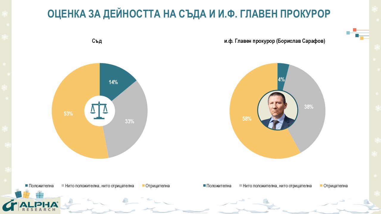 И през тази година обществените нагласи към съдебната система остават на обичайните равнища на недоверие. Най-критично е отношението към и. ф. Главен прокурор Борислав Сарафов (4% положителни, 38% неутрални и 58% отрицателни оценки). Одобрението за дейността на съда е 14%, срещу 53% неодобрение и 33% неутрално отношение.