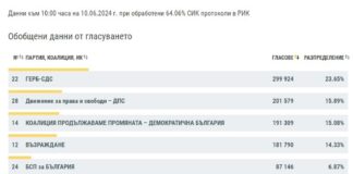 При обработени 77,87 % протоколи: ГЕРБ-СДС – 24,08 %, ДПС –...