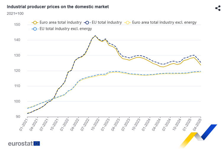 На годишна база цените на производител в индустрията в ЕС през април 2025 г. в сравнение с април 2024 г. нарастват с 0,5% за междинните стоки, с 1,6% за капиталовите стоки, с 1% за трайните потребителски стоки и с 2,1% за нетрайните, като за енергията се наблюдава спад от 0,5%.