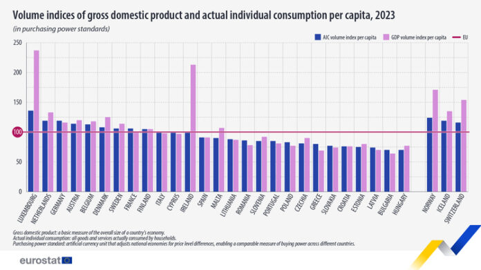 Има и значителни разлики между страните от Евросъюза през 2023 г. относно брутния вътрешен продукт (БВП) на човек, изразен чрез стандарта на покупателната способност (СПС).
