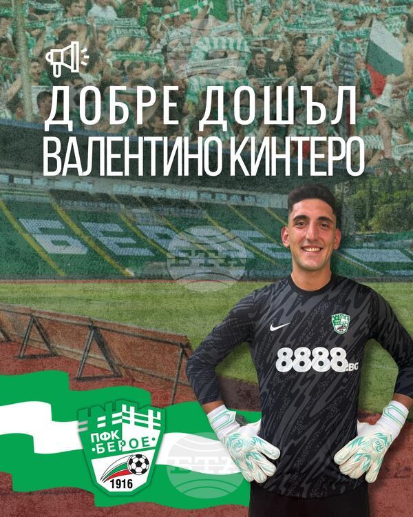 Футболен клуб Берое (Стара Загора) потвърди подписването на договор с аржентинския вратар Валентино Кинтеро, съобщиха от клуба.