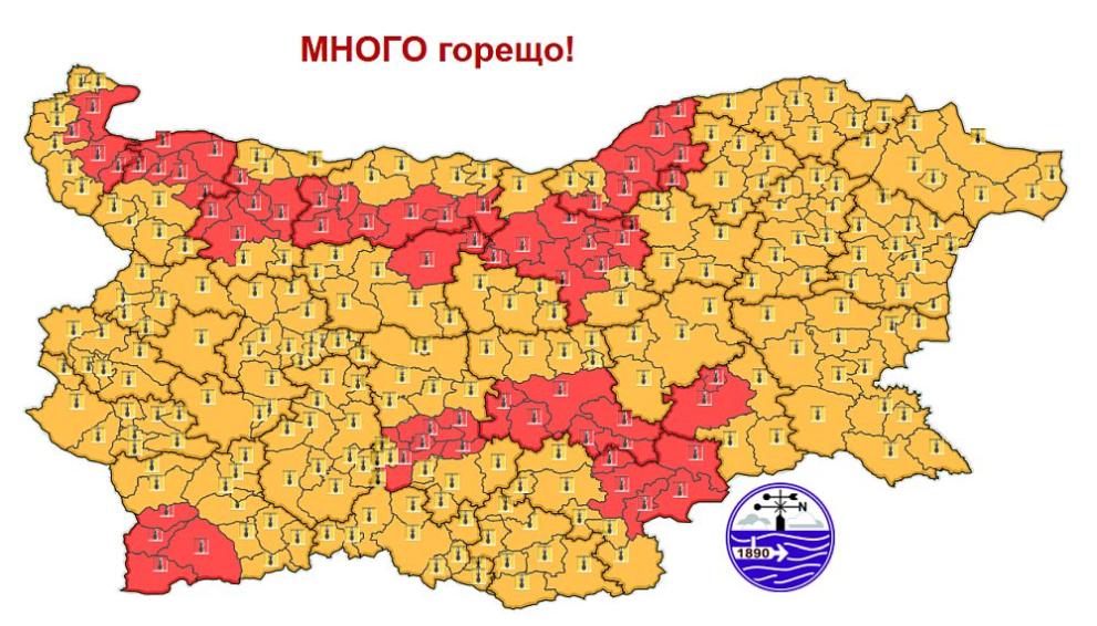 През деня отново ще е слънчево и много горещо. Синоптиците издадоха червен код за опасно време с екстремно високи температури до 43 градуса в 12 области: Видин, Монтана, Враца, Плевен, Ловеч, Велико Търново, Русе, Ямбол, Хасково, Стара Загора, Пловдив и Благоевград. В останалата част от страната е в сила оранжев код за опасно време.