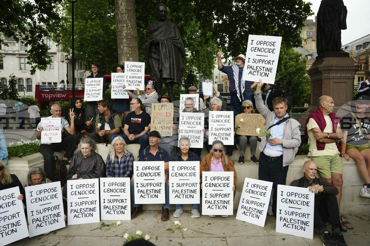 Днес, две малки групи протестиращи седят на стъпалата около статуите на Махатма Ганди и Нелсън Мандела, разположени на площада пред британския парламент. Някои от тях написаха „Против геноцида, в подкрепа на Действие за Палестина“ на плакати и ги държаха мълчаливо, заобиколени от полицаи, които се позиционираха около статуята на Ганди.