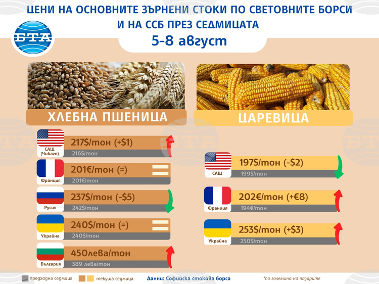 В Чикаго цената на пшеницата с доставка през септември нарасна с 1 долар, достигайки 217 долара за тон. Във Франция старата цена остана на ниво от 201 евро за тон, докато в Украйна котировката е 240 долара за тон. В Русия обаче цената спадна с 5 долара до 237 долара за тон, следвайки тенденцията от края на юли.