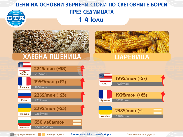 В Чикаго пшеницата за юлска доставка, след поредица от спадове, тази седмица бележи увеличение от 8 долара до 224 долара за тон. Във Франция се наблюдава умерен ръст – с 2 евро до 195 евро за тон. Украйна и Русия също добавят по 3 долара, сега цените им са съответно 229 и 226 долара за тон.