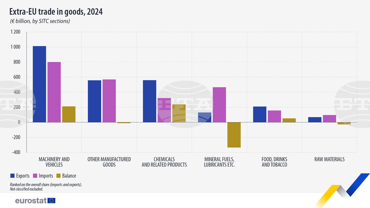 При други стоки, като минералните горива и свързаните с тях изделия, се наблюдава търговски дефицит. За минералните горива и смазочните материали дефицитът е значителен – 355 милиарда евро (с 131 милиарда евро износ и 466 милиарда евро внос), докато при суровините той е по-малък, достигащ 28 милиарда евро (68 милиарда евро износ и 96 милиарда евро внос). При останалите промишлени стоки дефицитът е минимален – 11 милиарда евро (558 милиарда евро износ и 569 милиарда евро внос).