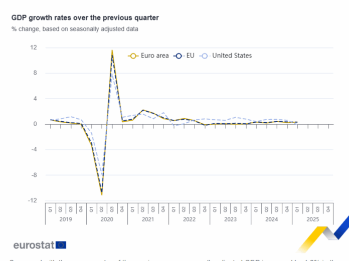 Брутният вътрешен продукт (БВП) и на Европейския съюз, и на еврозоната е нараснал с по 0,3 процента през първото тримесечие на 2025 г. спрямо същия последните три месеца на 2024 година. Това сочи най-новата предварителна и сезонно коригирана оценка на Евростат, публикувана днес на сайта на европейската статистическа агенция.