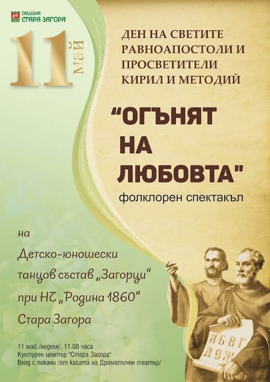 На 11 май, в деня когато православната църква почита Светите равноапостоли и просветители Кирил и Методий, жителите на Стара Загора и посетителите на града ще имат възможността да се насладят на фолклорен спектакъл с наименование „Огънят на любовта“, организиран от детско-юношеска танцова формация „Загорци“ при Народно читалище „Родина – 1860“. Това е посочено в програмата за предстоящи събития на Културен център „Стара Загора“, който ще бъде домакин на мероприятието.