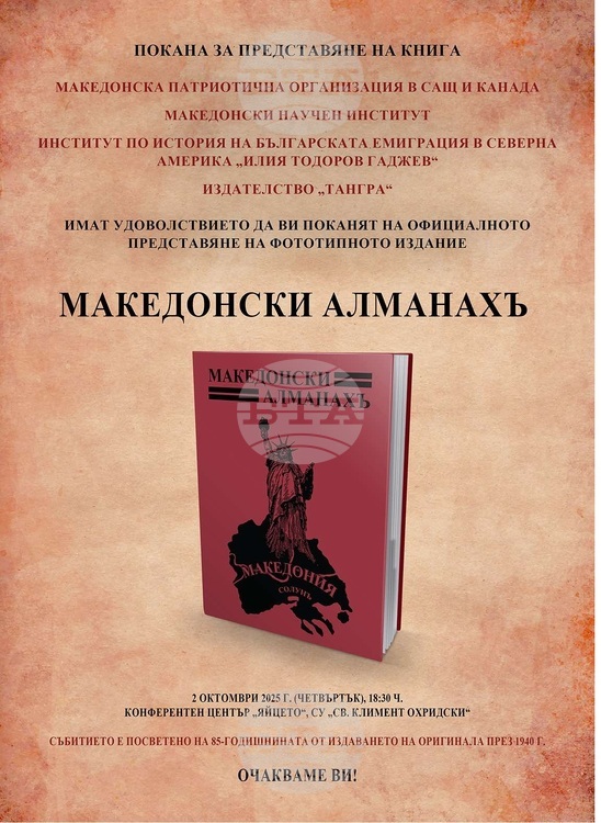 Днес, 2 октомври, в конферентната зала „Яйцето“ на Софийския университет „Св. Климент Охридски“ ще се проведе представяне на фототипно издание на „Македонски алманахъ“, съобщават организаторите. Събитието отбелязва 85 години от публикуването на оригинала.