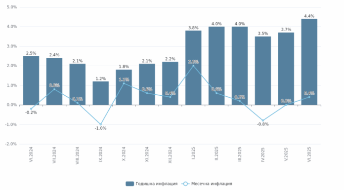 През юни 2025 г. месечната инфлация е 0.4%, а годишната инфлация за юни 2025 г. спрямо юни 2024 г. е 4.4%, обобщава националната статистика.