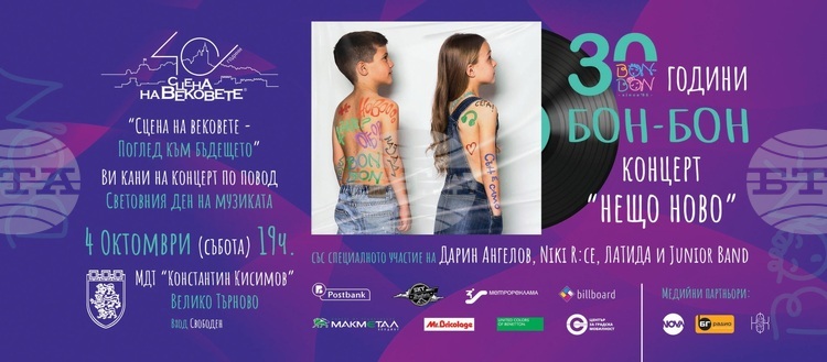 Група „Бон-Бон“ и техните приятели ще финализират програмата на „Сцена на вековете – поглед към бъдещето“ с юбилеен концерт във Велико Търново, който носи заглавието „Нещо ново“. Събитието ще се проведе на 4 октомври в Музикално-драматичен театър „Константин Кисимов“, съобщиха от организаторите.