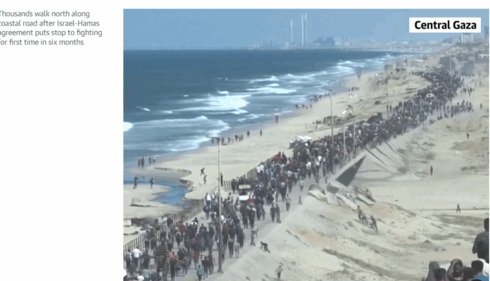 Израелските военни предупредиха жителите на Газа да използват определени маршрути, за да се върнат на север, като избягват рисковите райони като Бейт Ханун и граничния пункт Рафах, където израелските войски все още са разположени. Въздушните удари в Газа продължиха дори до самото влизане в сила на примирието.