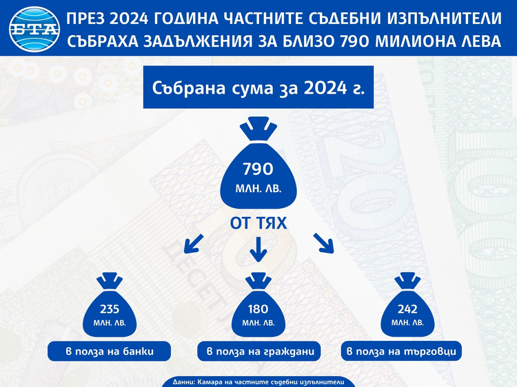Събраната сума за 2024 г. ще бъде 790 млн. лв., разпределена както следва: в полза на гражданите – 180 млн. лв. – всяка година тези суми нарастват с 20 млн. лв. в сравнение с предходната година (издръжки – осем млн. лв., неизплатени заплати – шест млн. лв.); банки – 235 млн. лв. – спад с 60 млн. лв. (реално, сумата в полза на банките е значително по-малка, тъй като повечето от тези дела са прехвърлени на колекторски компании, но статистиката отразява постъпленията в полза на банките, а тези средства следва да се отнесат на търговците); търговци – 242 млн. лв. – увеличение с 23 млн. лв.; за държавни органи, общини и съдилища – 72 млн. лв. (държавни органи – 24 млн. лв., общини – 45 млн. лв., съдилища – три млн. лв.).