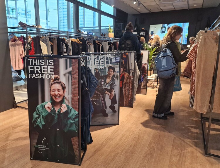 Магазинът е временен и е част от новия тренд в Нидерландия: Free Fashion (Мода без разходи): взимате каквото ви харесва, но… не плащате. Дрехите на закачалките идват от гардеробите на дарители или са предоставени от модни марки поради производствени несъответствия.