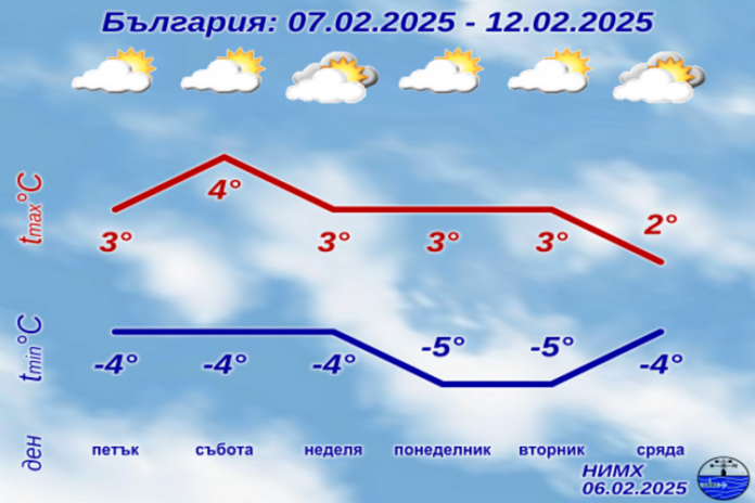 В близките дни времето в България ще бъде студено, като температурите ще продължат да спадат. Най-ниските стойности се очакват в неделя, 9 февруари, и понеделник, 10 февруари. Тази информация е предоставена от седмичната метеорологична прогноза на Националния институт по метеорология и хидрология (НИМХ) за периода от 7 до 12 февруари.