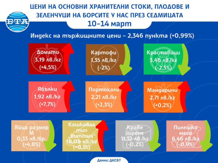 Цените на основните хранителни стоки, плодовете и зеленчуците на борсите в България се повишават с близо 1 процент, показва седмичното издание на Държавната комисия по стоковите борси и тържищата (ДКСБТ).
