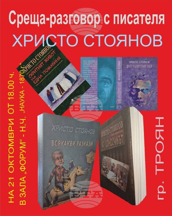 На 21 октомври в троянското читалище „Наука – 1870 г.“ ще се проведе разговор с писателя Христо Стоянов, съобщи Станка Марешка, секретар на културната институция, за БТА. Събитието ще започне в 18:00 часа и ще се проведе в зала „Форум“.