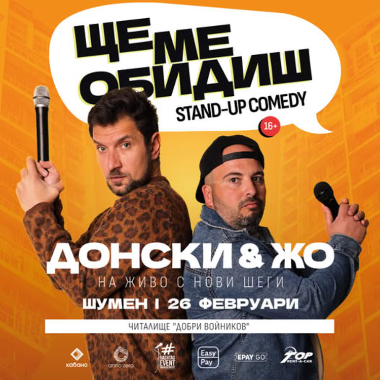 Стендъп комедийната програма „Ще ме обидиш“ ще се проведе днес в Народно читалище „Добри Войников-1856“ в Шумен. На сцената ще се представят Димитър Донски и Желязко Желязков, известен като Жо. В интервю за БТА комиците споделиха, че в техния спектакъл обсъждат българската история, традиции и табу теми от любовния и семейния живот, както и особеностите на отглеждането на деца през 90-те години на миналия век.