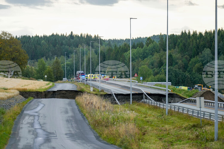 На магистрала E6 и близкото железопътно трасе внезапно се образува голям кратер. Снимките показват, че част от терена е паднала в съседното езеро Несватнет.