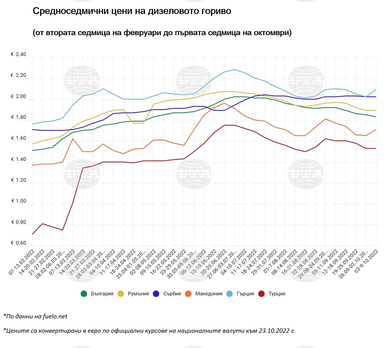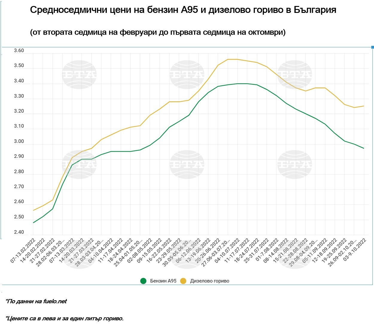 Средната цена на бензина в България за седмицата приключваща на 9 октомври е била 2,97 лева за литър, като в сравнение със седмицата приключваща на 11 септември, когато е достигала 3,13 лева, e по-ниска с 5,1 на сто. За същия период дизела по родните бензиностанции е поевтинял с 3,6 на сто от 3,37 лева до 3,25 лева.