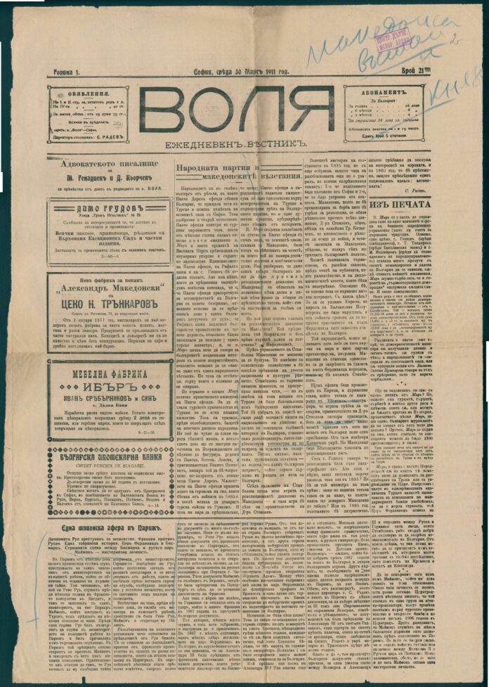 През пролетта на 1911 г. излиза първият брой на ежедневника „Воля“ с директор-стопанин Симеон Радев. Вестникът е определян в библиографски справочници и изследователски текстове като вестник на Народнолибералната партия или свързан с крилото на Никола Генадиев в тази партия (партийно издание е и в. „Нов век“, с подзаглавие Орган на Народната либерална партия).