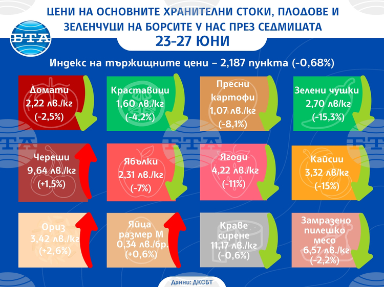 Повечето зеленчуци и плодове, с изключение на картофи, червени чушки и череши, поевтиняват на борсите в България през последната седмица на юни, според седмичния отчет на Държавната комисия по стоковите борси и тържищата (ДКСБТ).