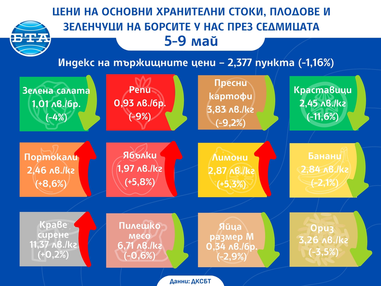 Най-съществено поевтиняване се наблюдава при краставиците, които падат с 11,6% до 2,45 лева за килограм. Цените на зеления пипер също значително намаляват с 9,1% до 4,88 лева за килограм, а репите се търгуват с 9% по-ниско – по 0,93 лева за брой. Картофите обаче поскъпват с 1,1% до 1,40 лева за килограм, докато пресните картофи отстъпват с 9,2% до 3,83 лева за килограм. Има намаление и при зелената салата, чиято цена е спаднала с 4% и се търгува за 1,01 лева за брой, както и при доматите – с 3,1% до 2,86 лева за килограм.
